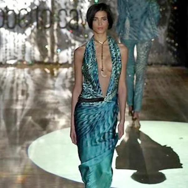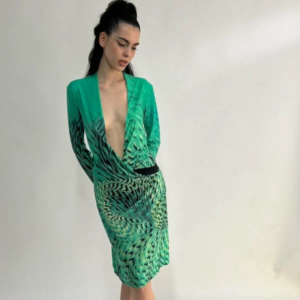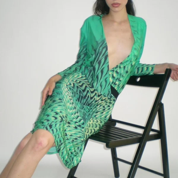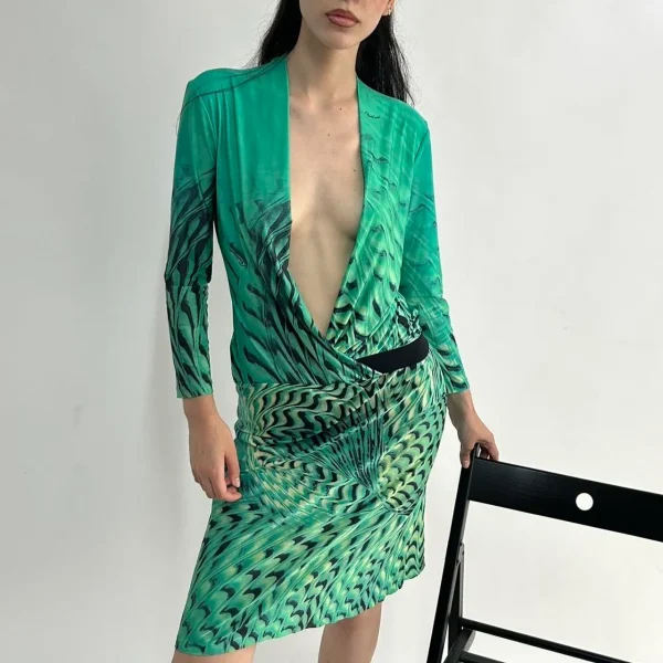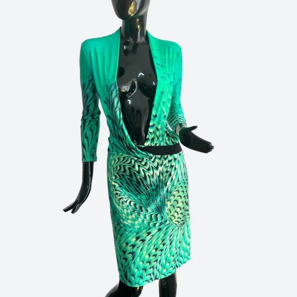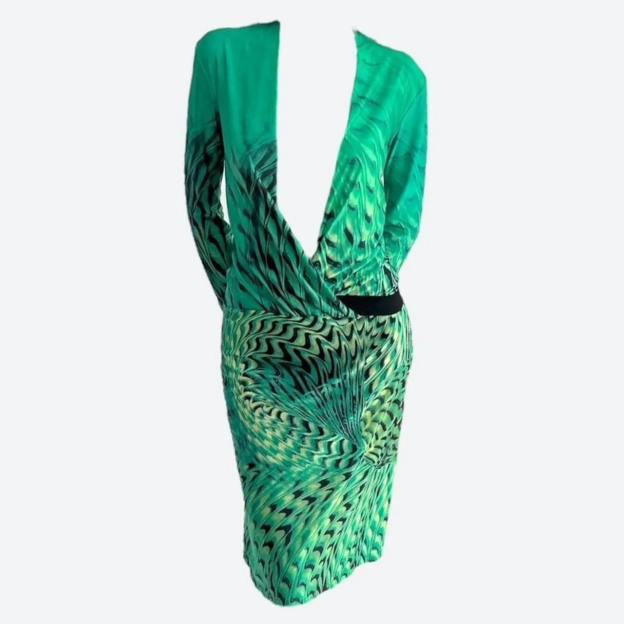 Roberto Cavalli psychedelic midi emerald green print dress from SS 2001, a show crucial in defending much of the iconic fashion from the turn of the millennium. and omg the amazing neckline/pattern from 2000!! Made in Italy.
