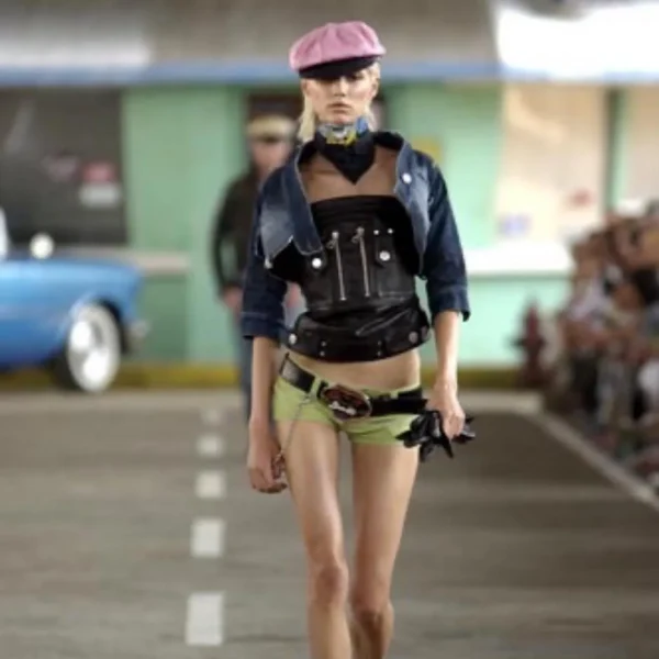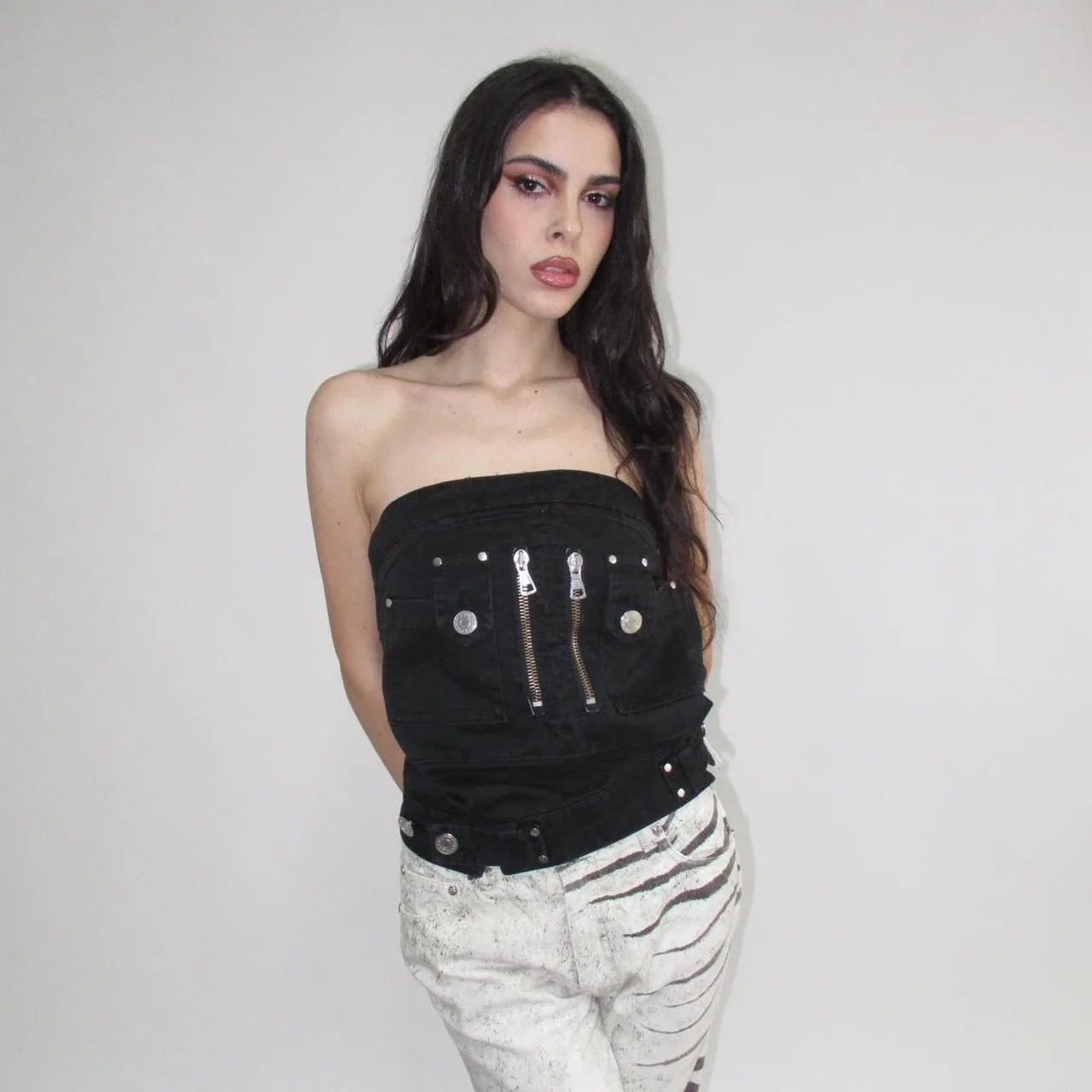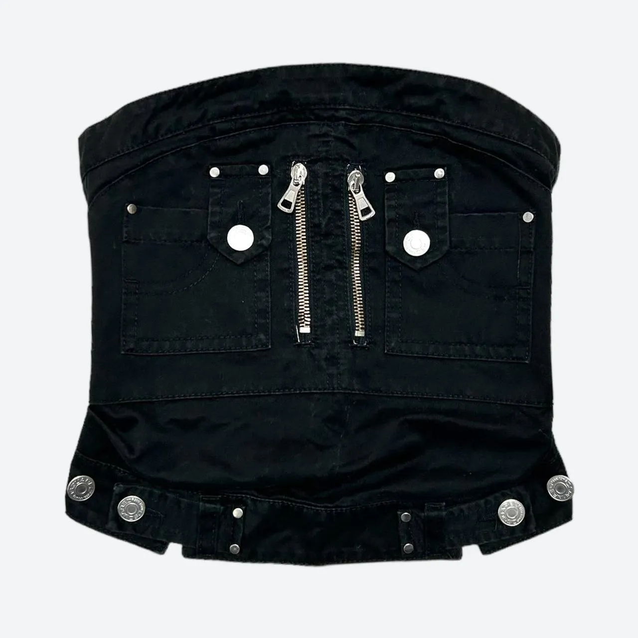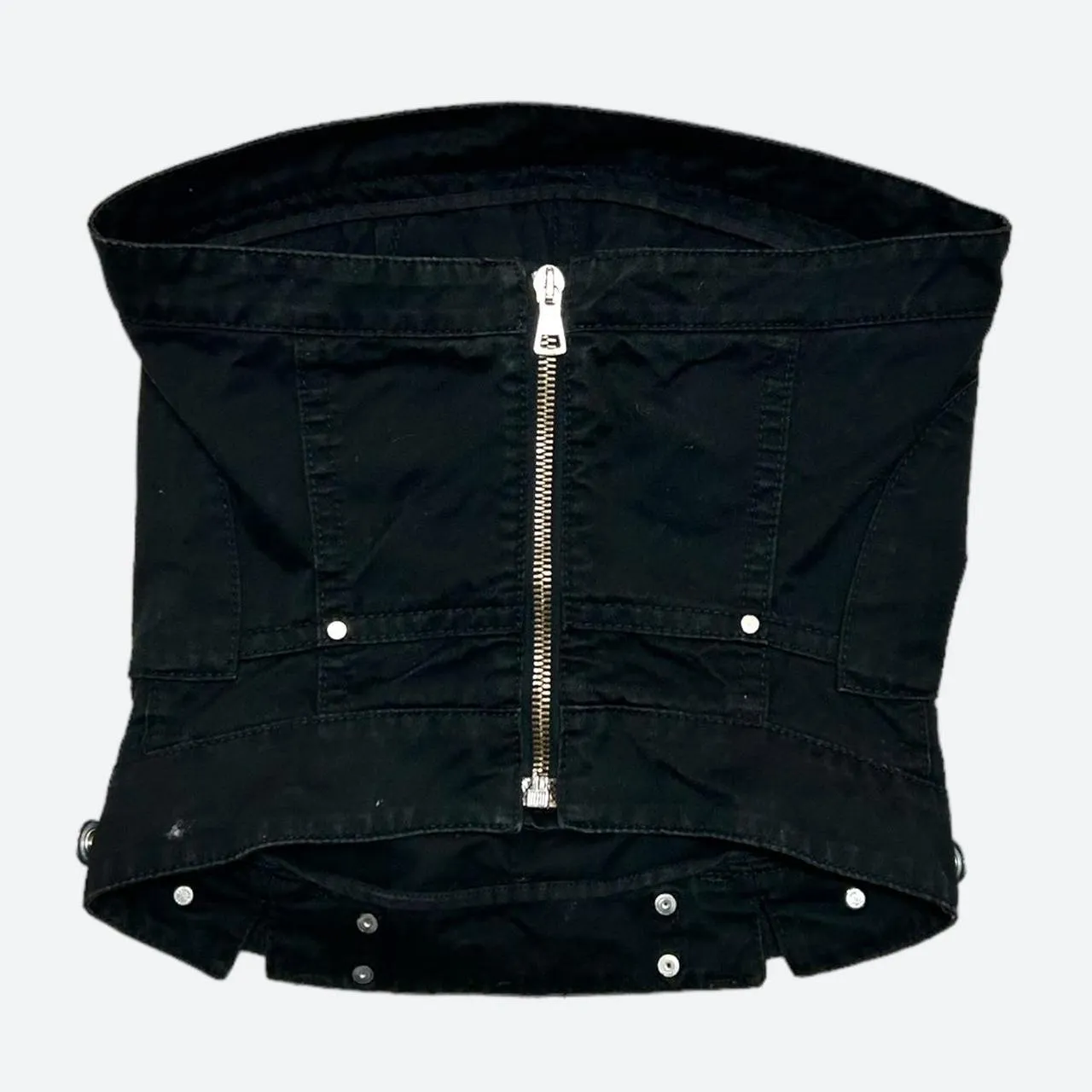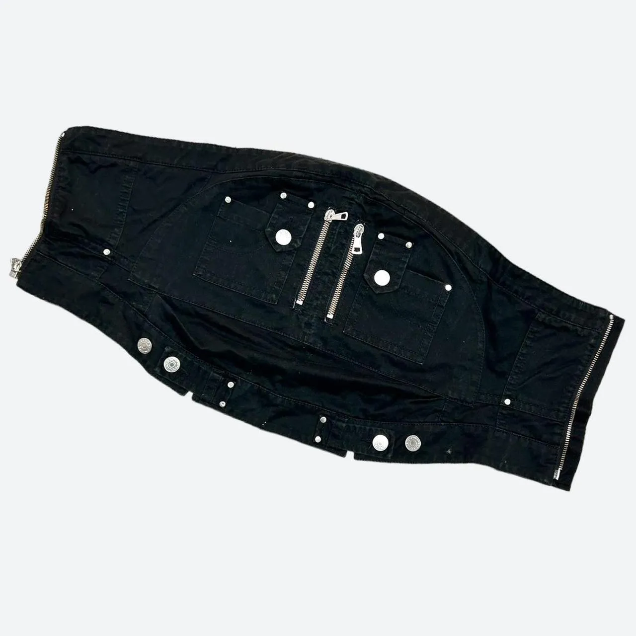 Dsquared2 SS04 Black Denim Bustier. This iconic biker style piece full of pockets and details wreck the show in the mid 00s.