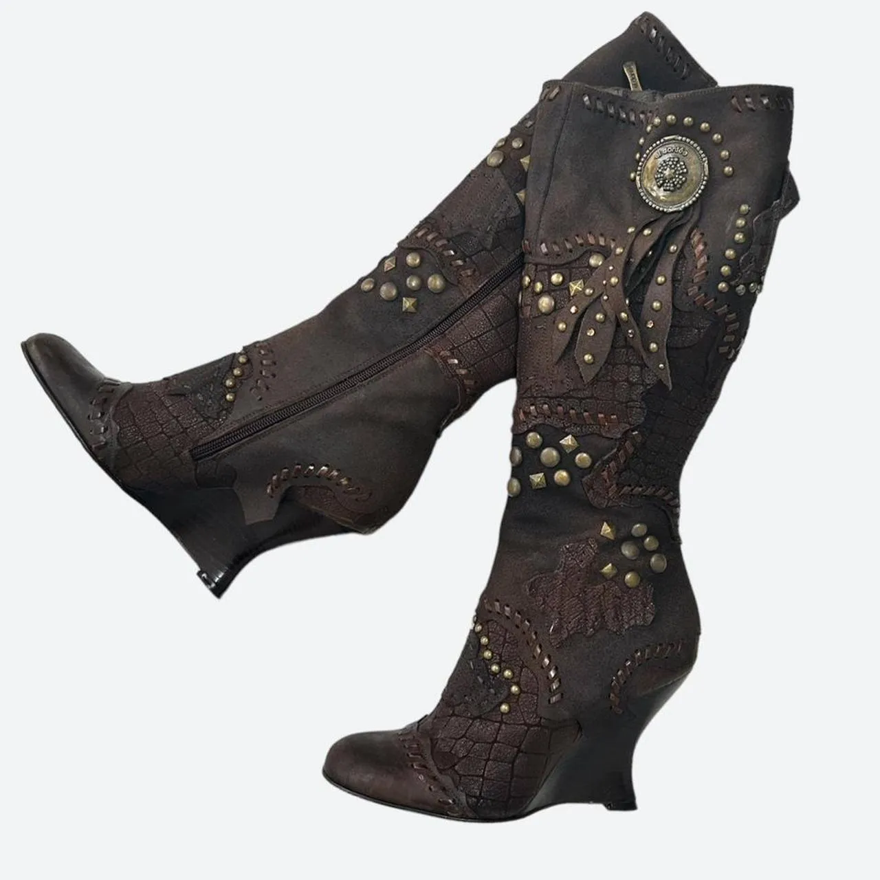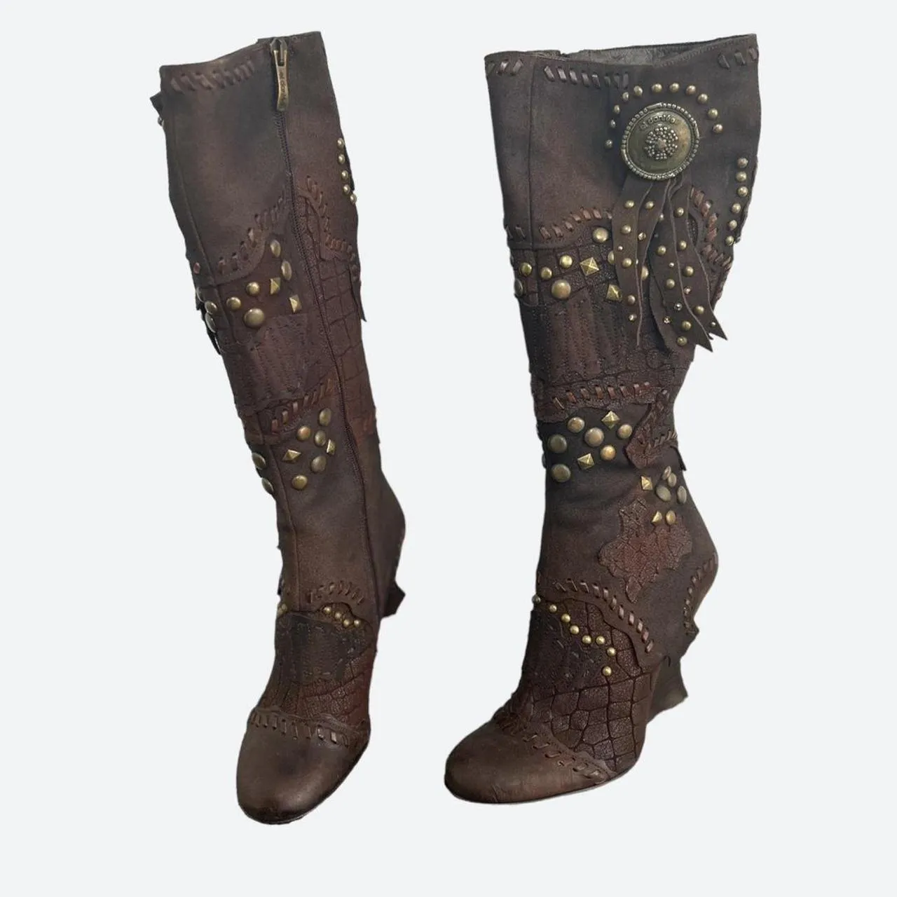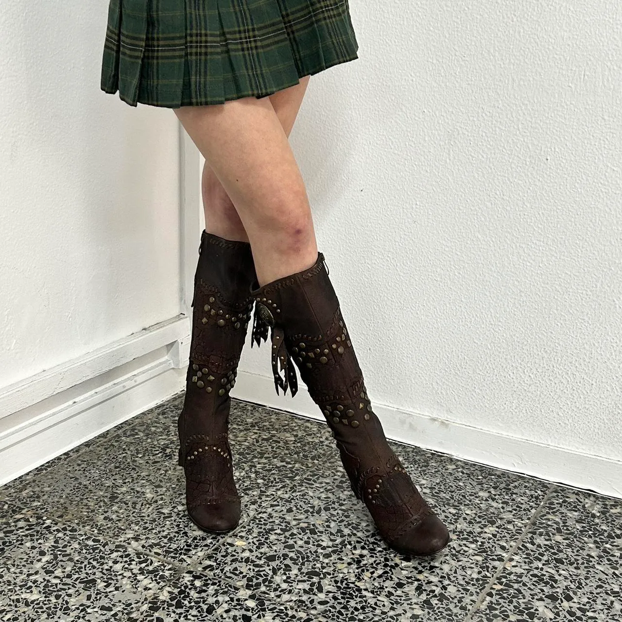 El Dantes brown leather boots with many studs and the detail of the deformed heel in perfect condition. Made in Spain.