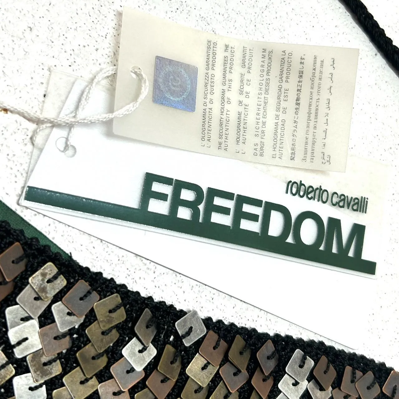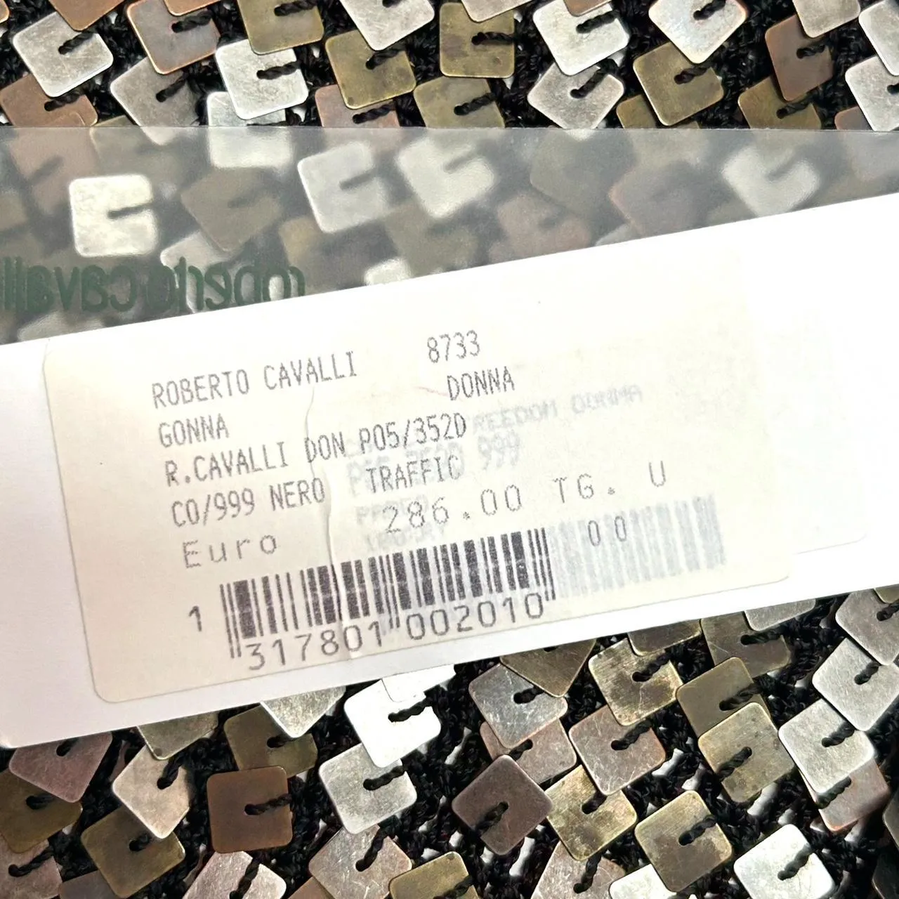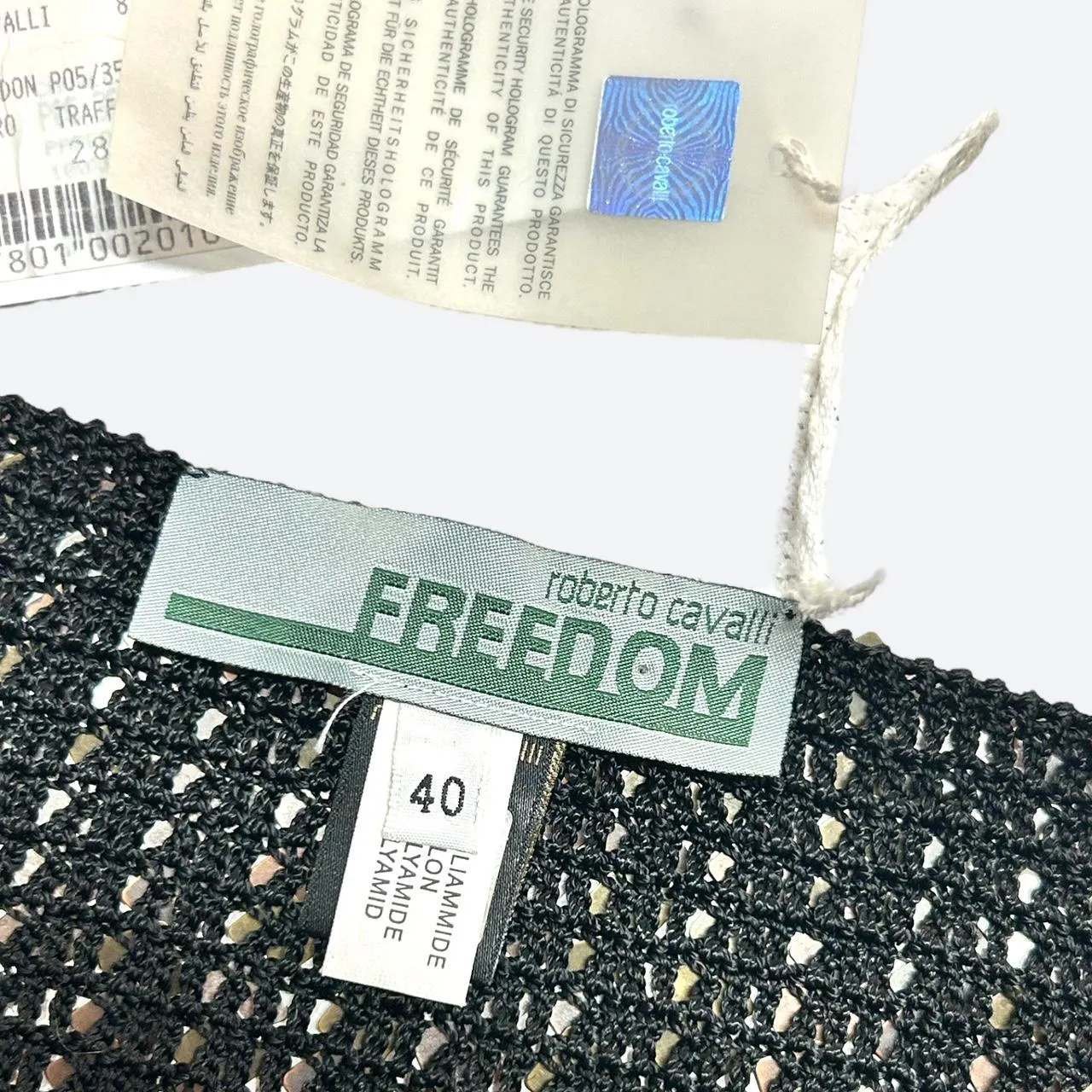 Roberto Cavalli Freedom early 00s micro sarong. This rare piece is fully made with metallic sequins on a knitted black base. Perfect to wear as a complement. Pristine vintage condition. Original tags.