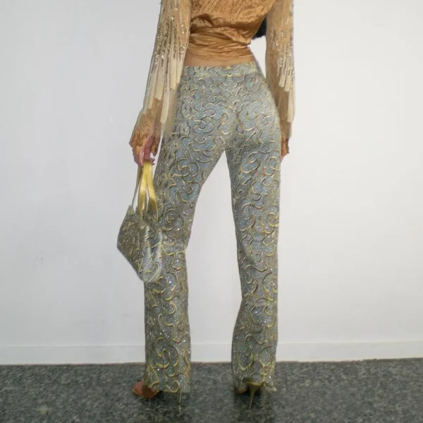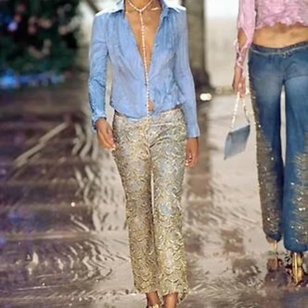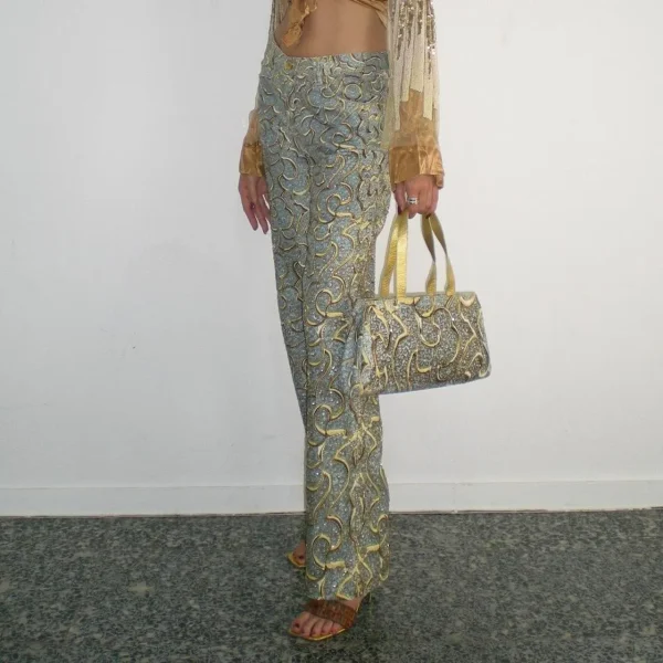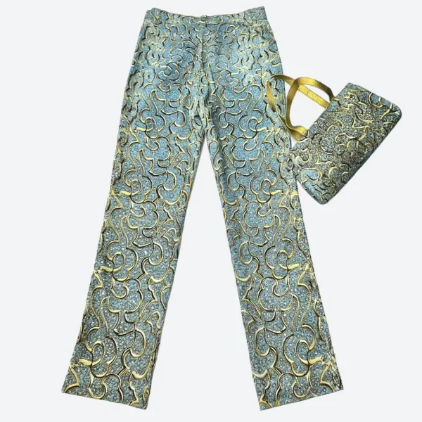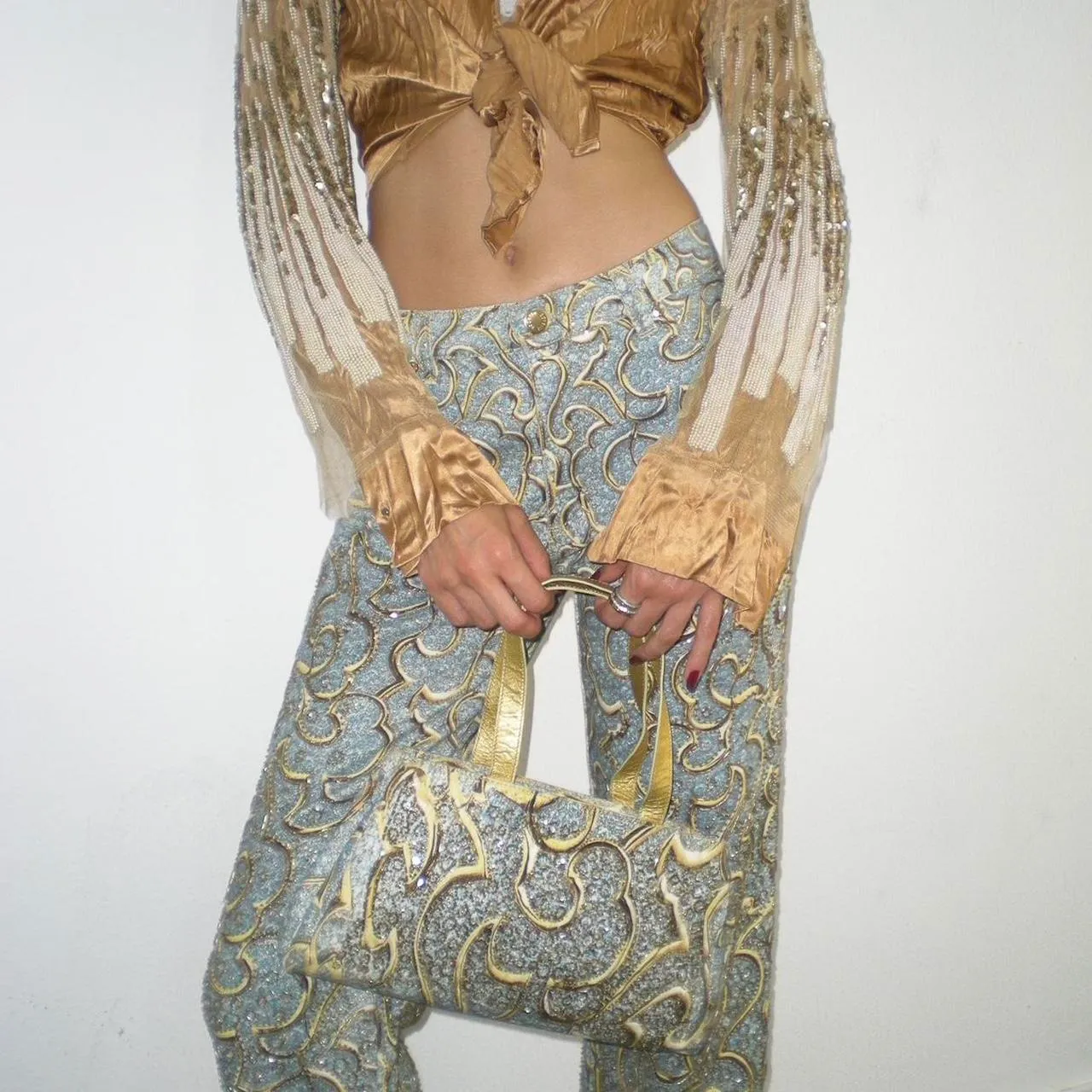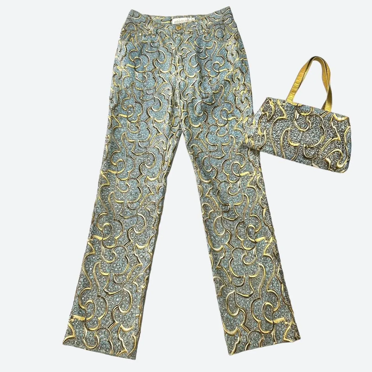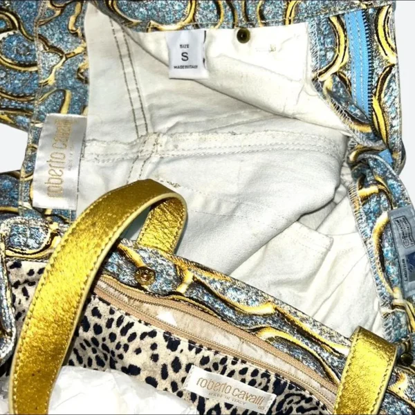 ROBERTO CAVALLI SS 2000 (Diamond Collection Campaign + Runway) Blue and Gold Baroque Motifs Hand Beaded Jeans with this Beautiful Bag Full of Beads and Sequins too in perfect vintage condition. Made in Italy