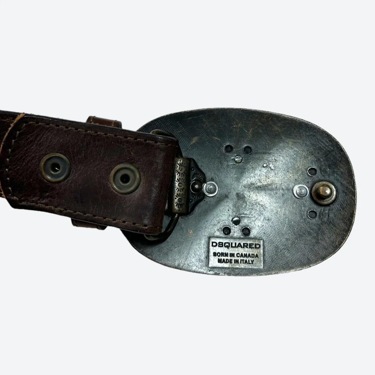 Dsquared2 brown leather belt. Crazy belt from the 2000s with this chunky iron and leather buckle with the logo in it. Pristine condition (like new). From 2003/2006 and seen in the new FW 2023 campaign.