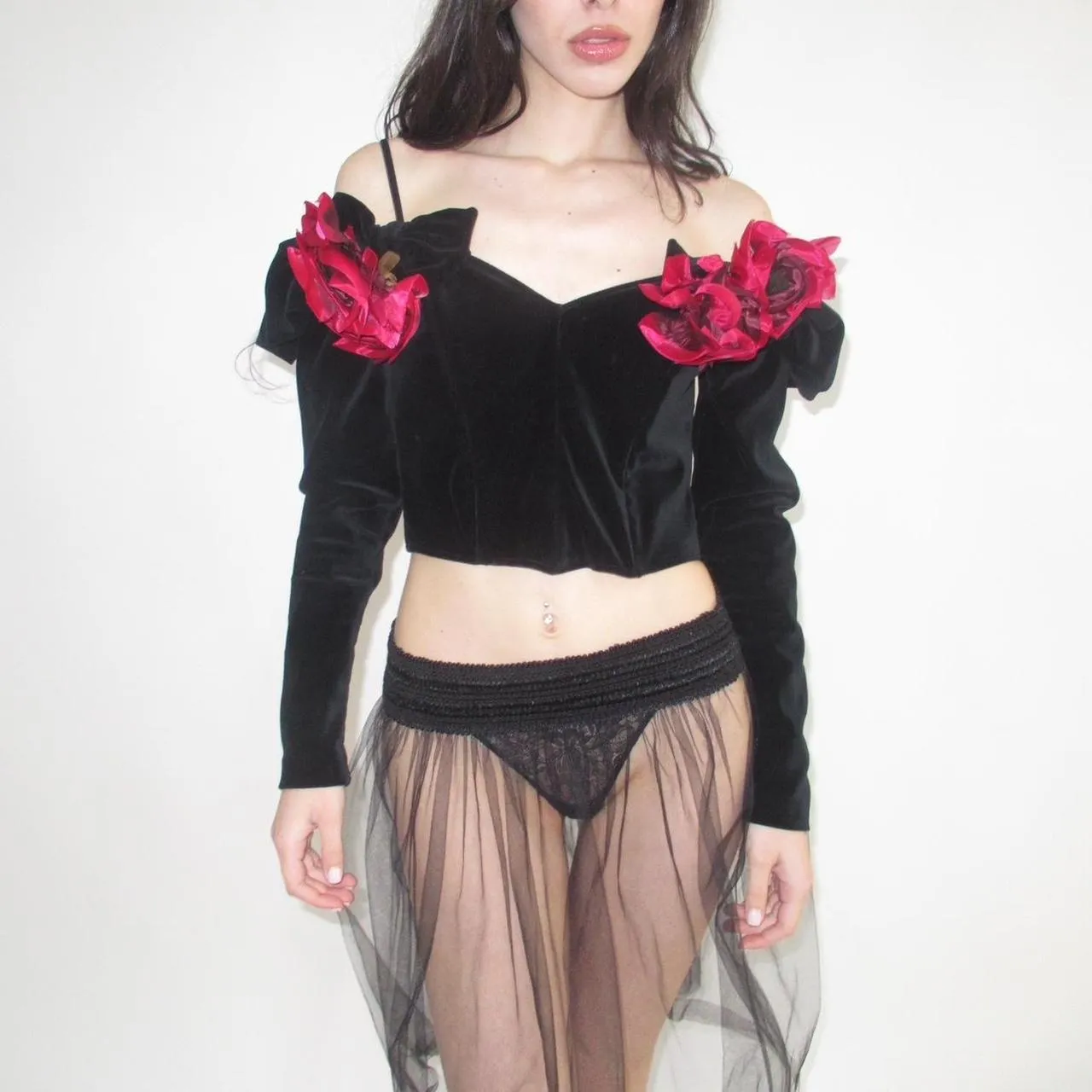 BLUMARINE X ANNA MOLINARI 1992 BLACK VELVET BUSTIER WITH SEWN RED FLOWERS