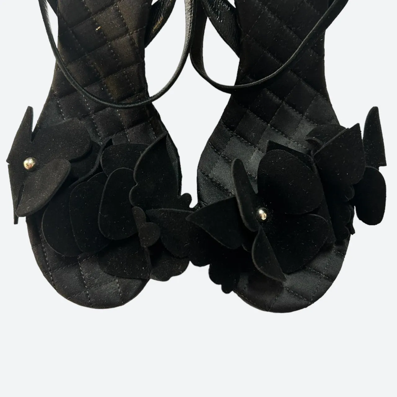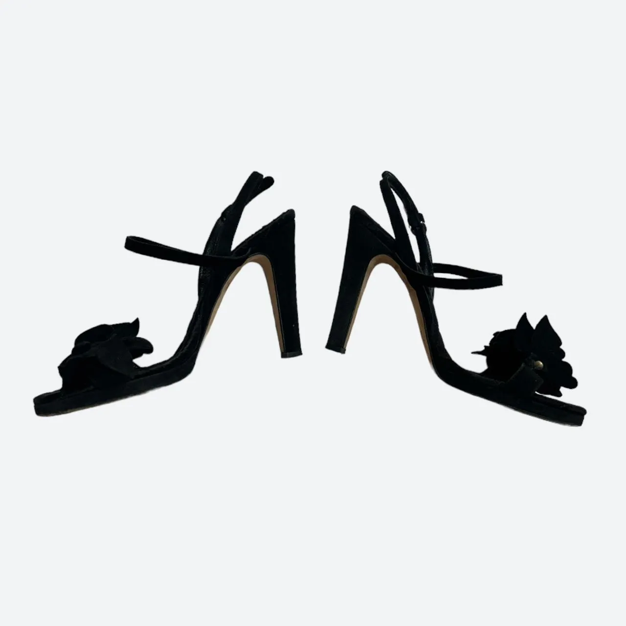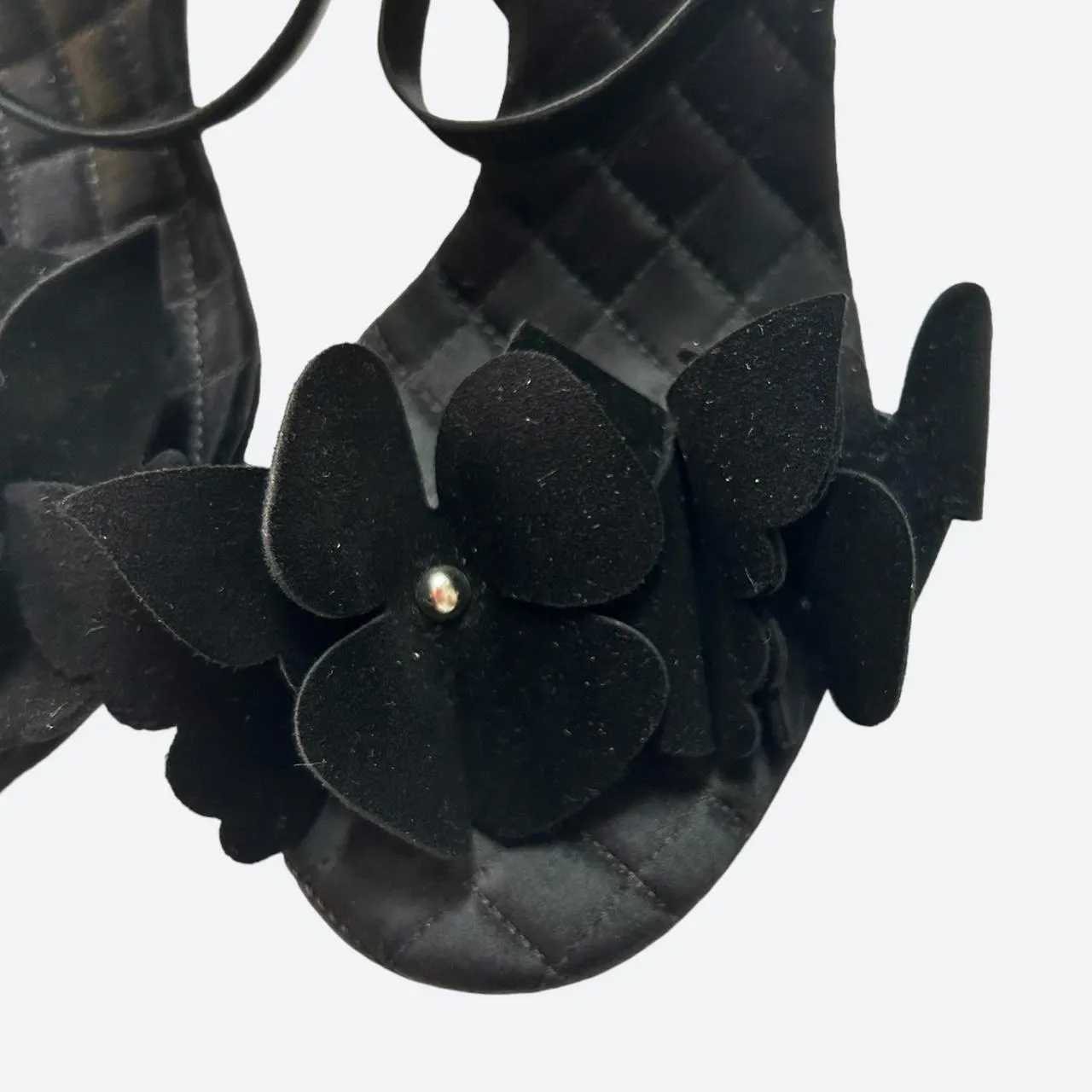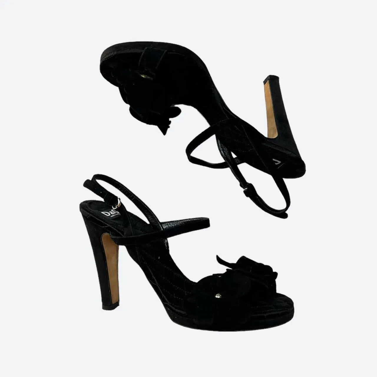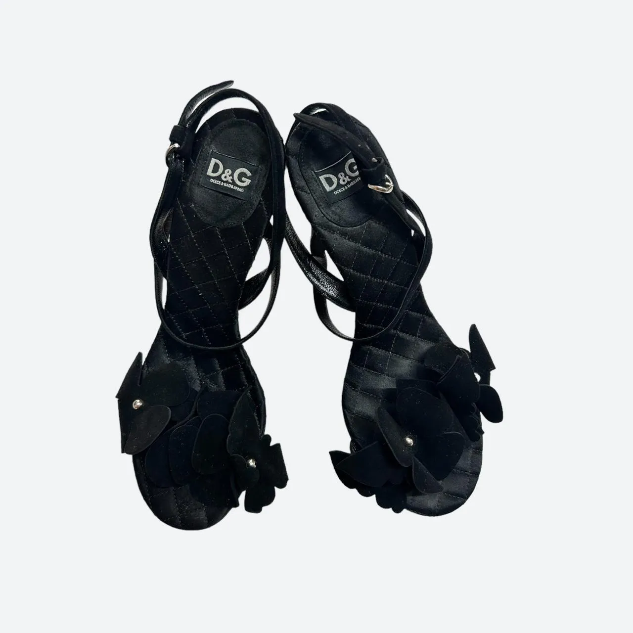 Dolce&Gabbana “D&G” black velvet and leather heels. This high heeled chic sandals from the mid 00s features this beautiful details of black daisies and butterflies. Very good vintage condition, the sole is used but the rest is in perfect condition.