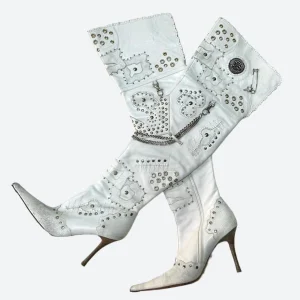 These Dolce & Gabbana FW 1999 boots feature a bold and eclectic design, blending various textures and colors. The main body of the boots is made from a brown suede-like material, while purple croc-embossed leather accents run along the toe and sides, adding a luxurious contrast. A striking blue lace-up detail runs along the front, giving the boots a corset-like appearance. The heels stand out in a bright pink, curved stiletto shape, adding a playful and modern twist. The combination of materials, colors, and the high lace-up style makes these knee-high boots a statement piece, reflecting the daring fashion of the late ’90s. Pristine vintage condition.