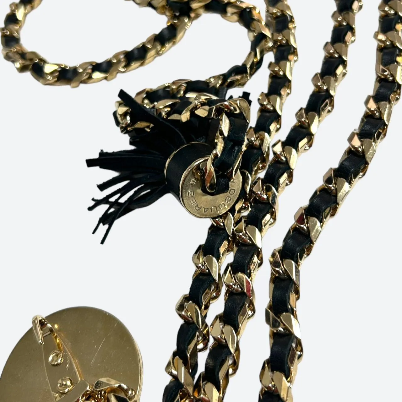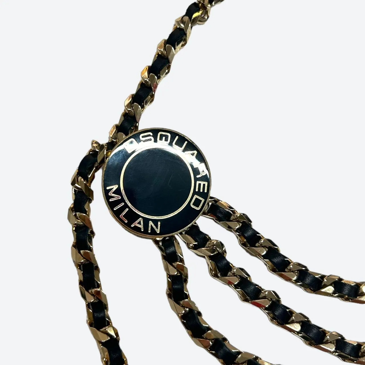 Dsquared2 Resort 2013 Chain Belt. Seen it in Cara Delevigne for the collection look book photos. Made out of golden metal and black leather with the logo in de buckle. Perfect vintage condition.