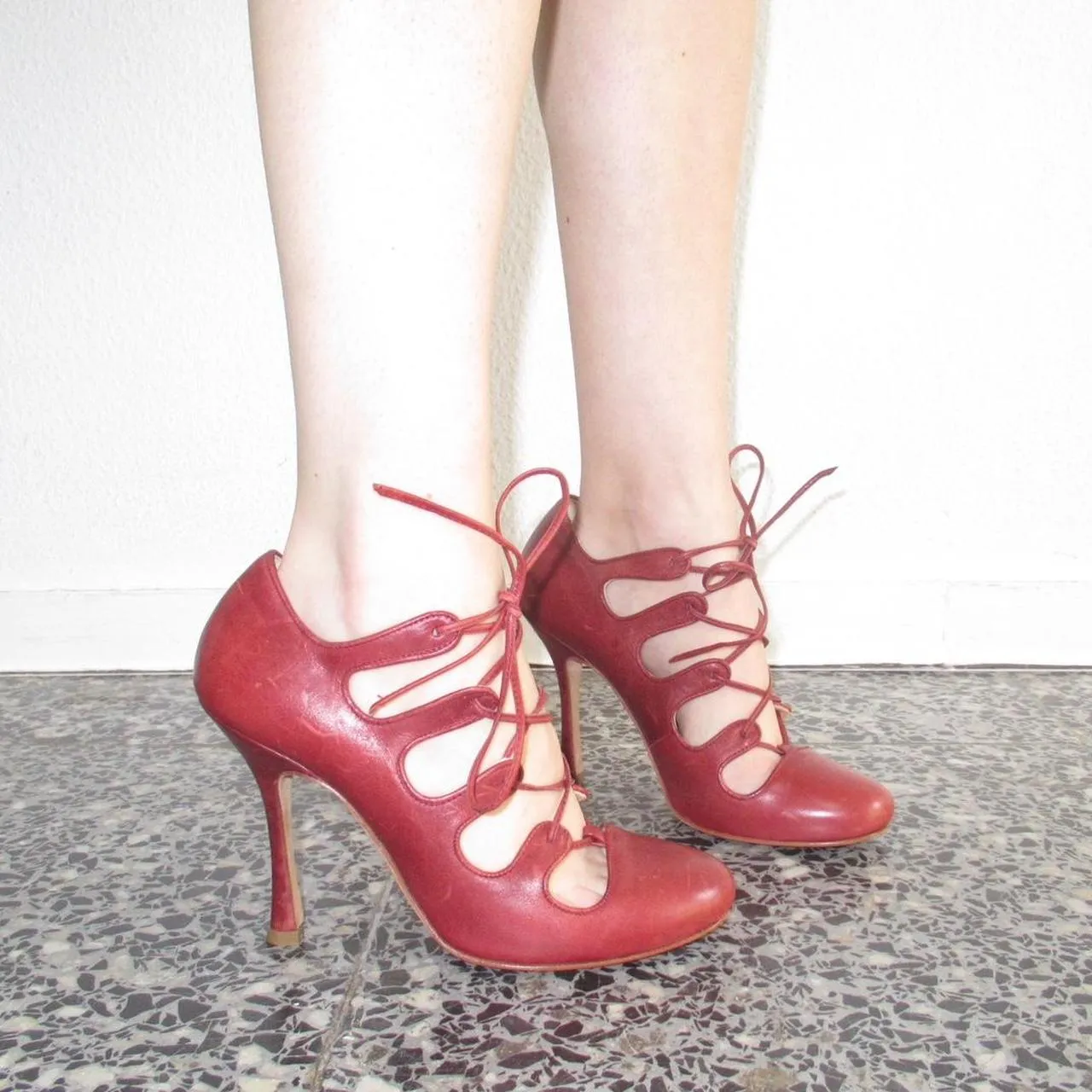 “Galliano” by John Galliano Maroon leather sandals . Iconic heels from mid 00s. Very representative from the designer and his taste for the early 20th century style. Excellent vintage condition.
