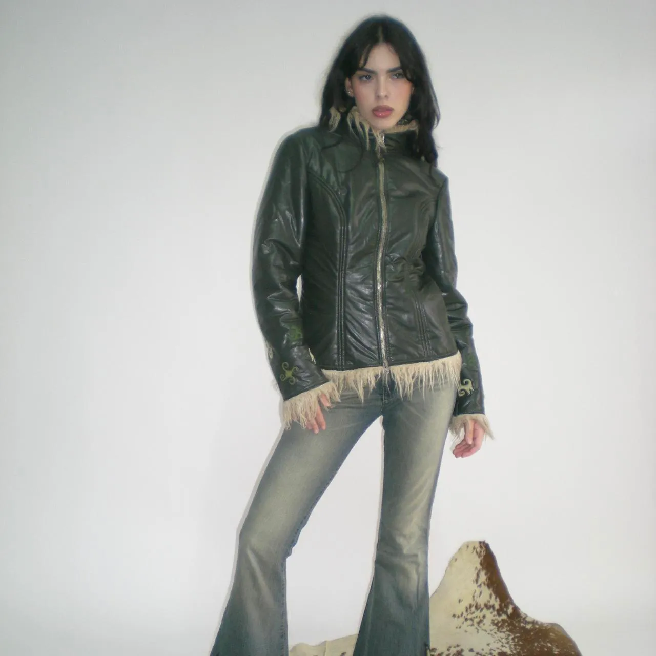 Miss Sixty iconic late 90s/ early 2000 black with green undertone color afghan style jacket. It has this runes embroidery in the arms. In very good vintage condition.