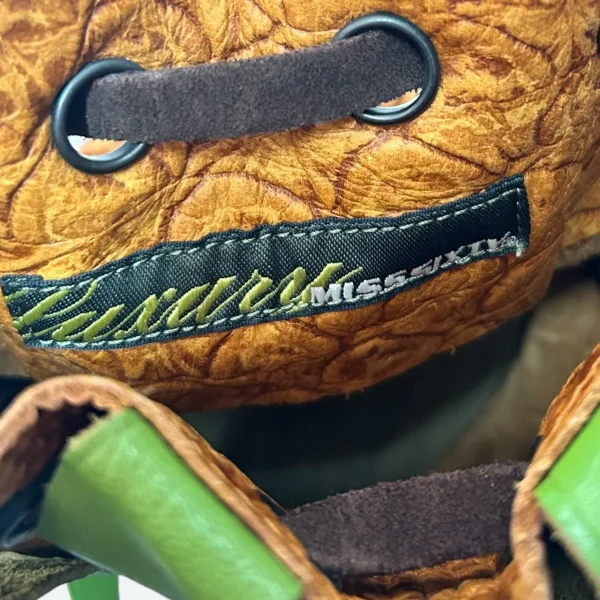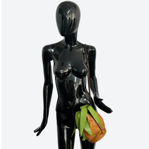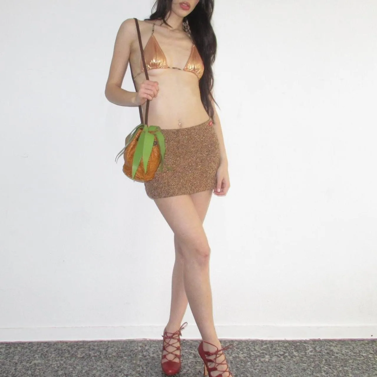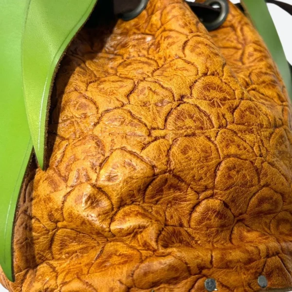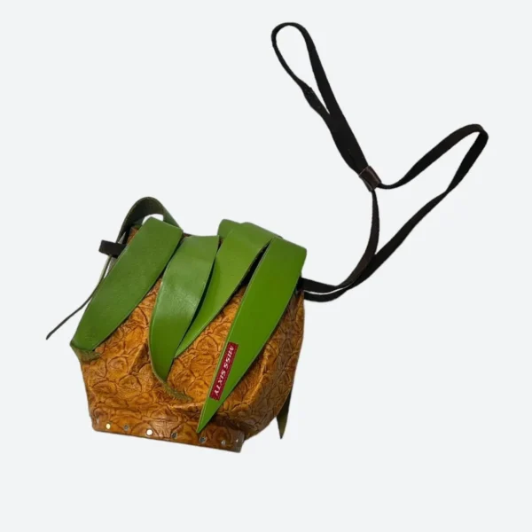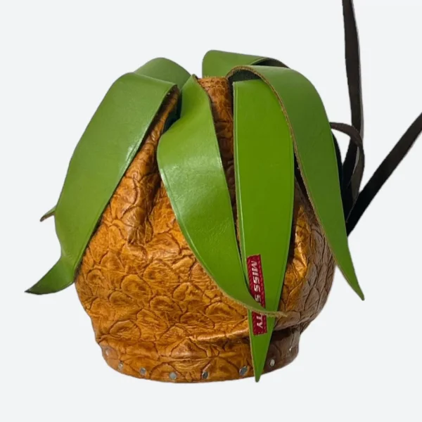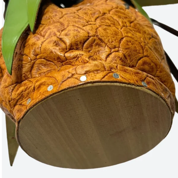 Miss Sixty Luxury leather pineapple mini bag. Very crazy and well elaborated leather bag from the 00s with this engraved leather. It has a wooden base and a green leather form leafs that achieved a very realistic finish. Perfect for the beach. Very rare piece from the brand. New vintage condition.