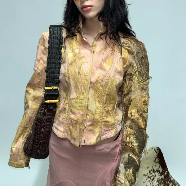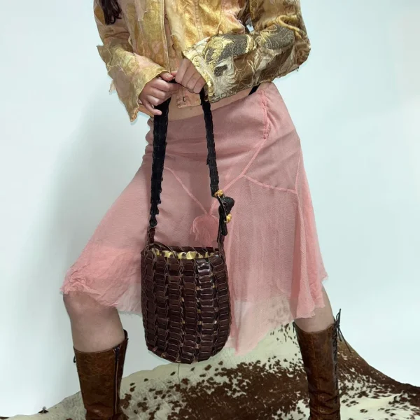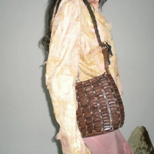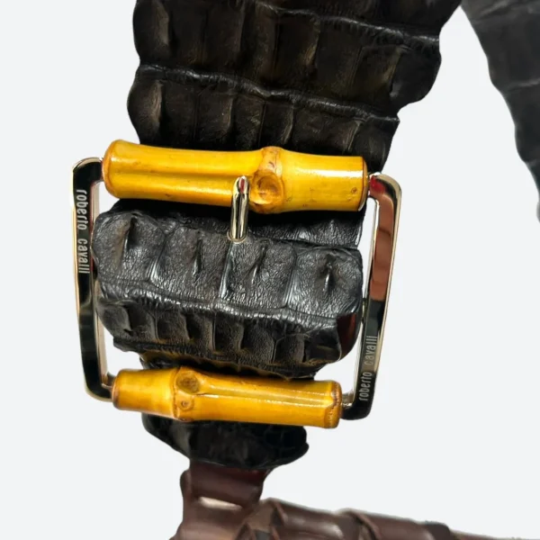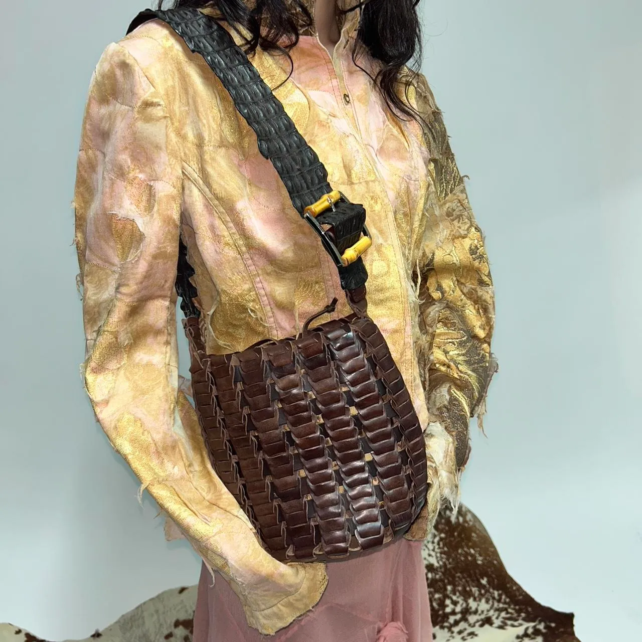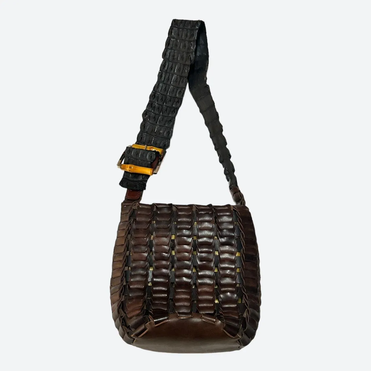 Roberto Cavalli intricate leather +croc bag. Very rare bag made with criss-crossed strips of leather, bambú + metallic buckle and the strap is made of alligator. Pristine vintage condition.